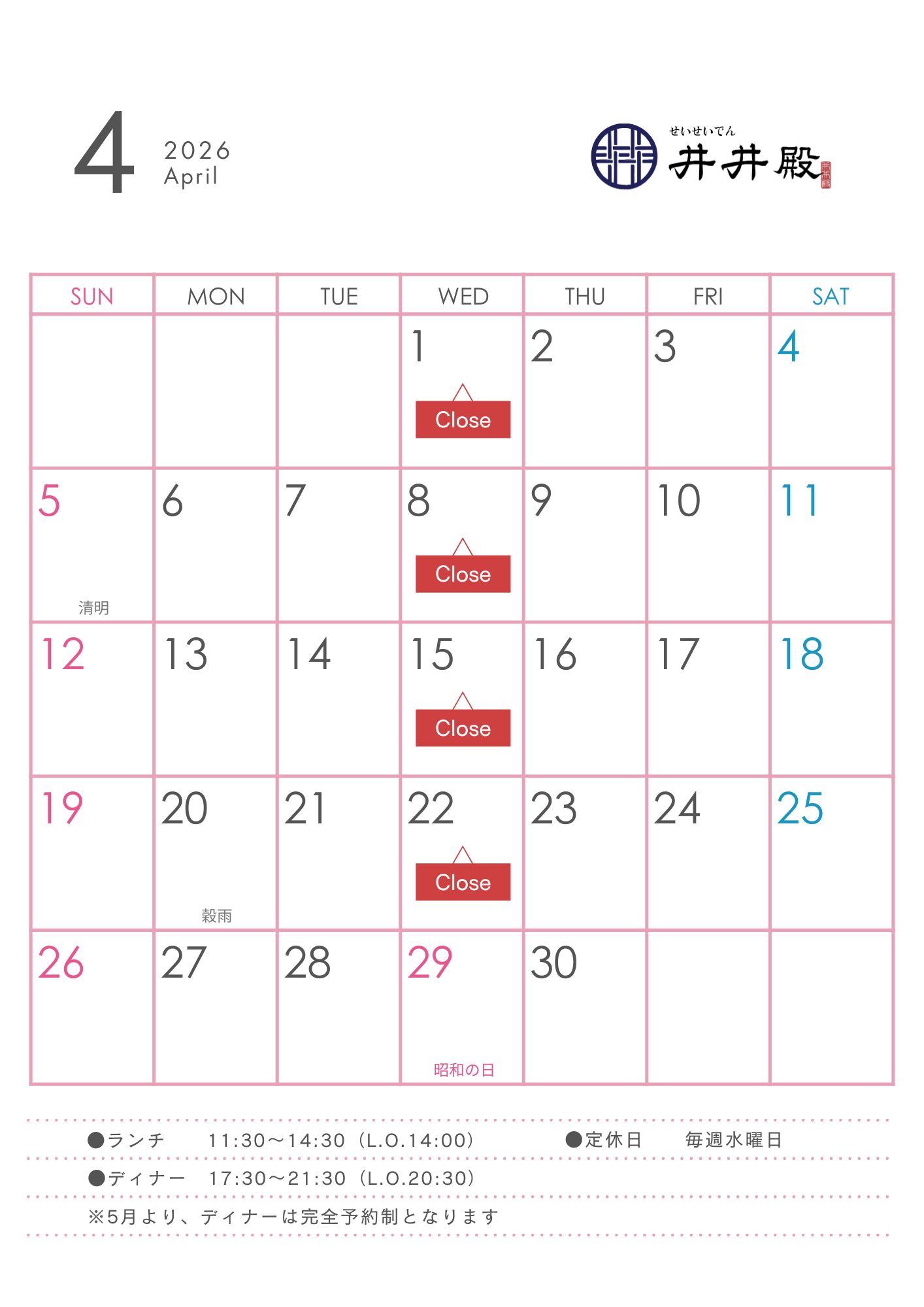 トップページ > トピックス > 【井井殿】4月営業カレンダー