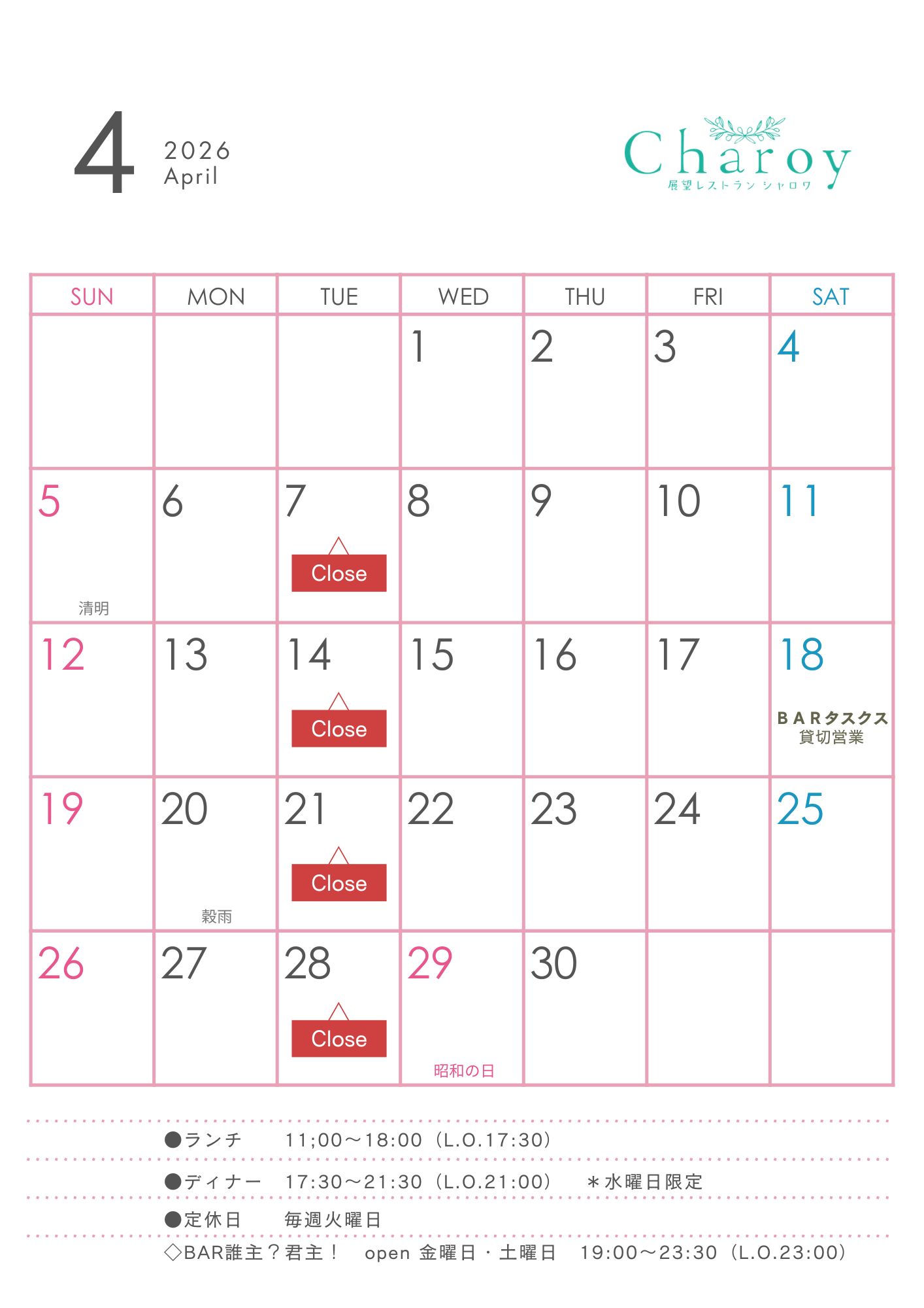 【シャロワ】4月営業カレンダー