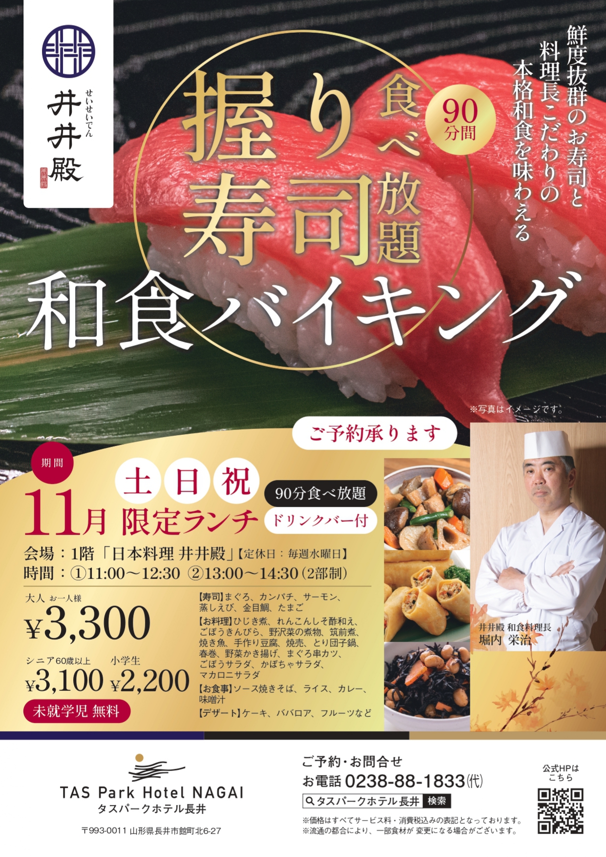 寿司食べ放題(90分食べ放題、ドリンクバー付き)を実施いたします。
