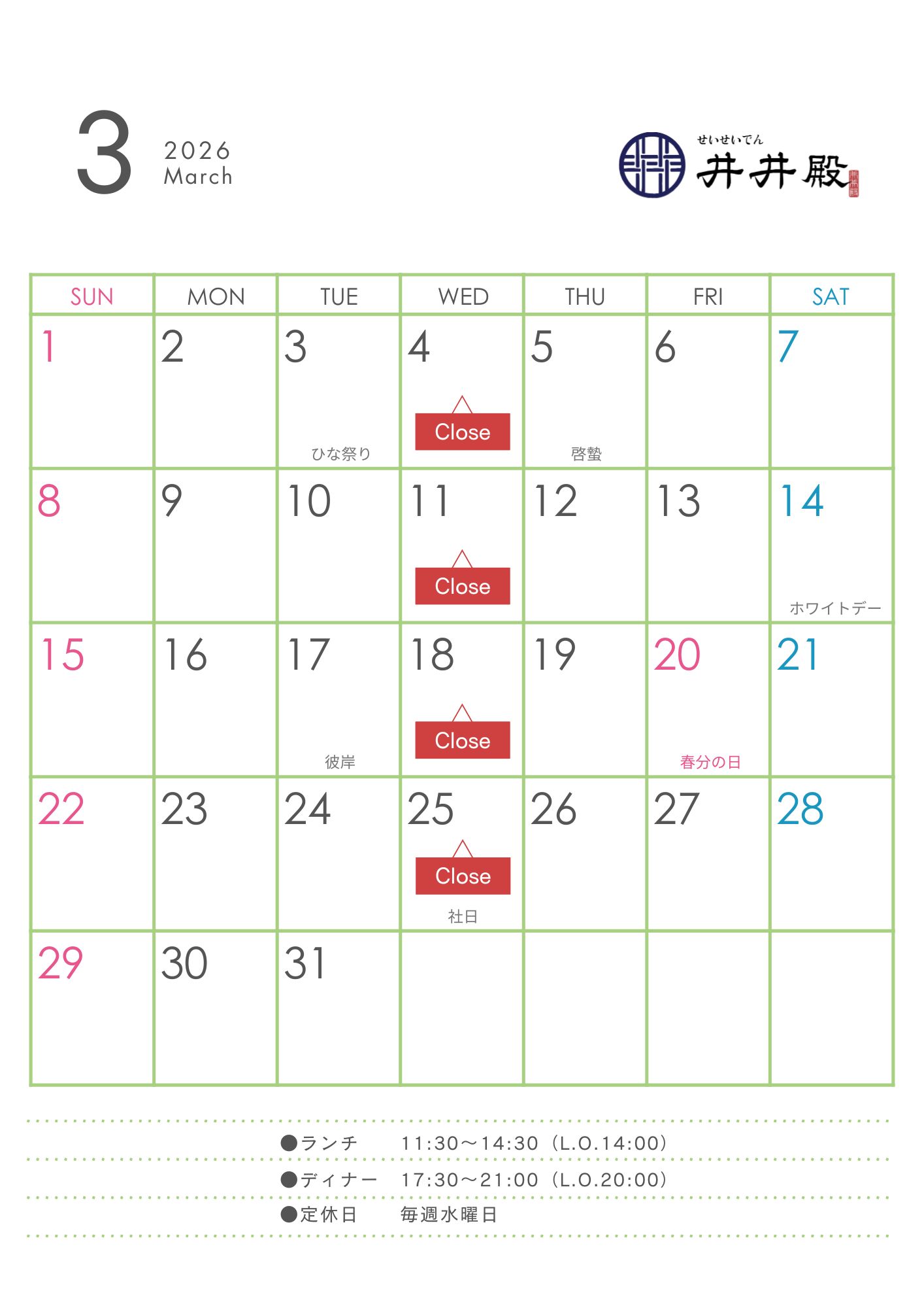 トップページ > トピックス > 【井井殿】3月営業カレンダー